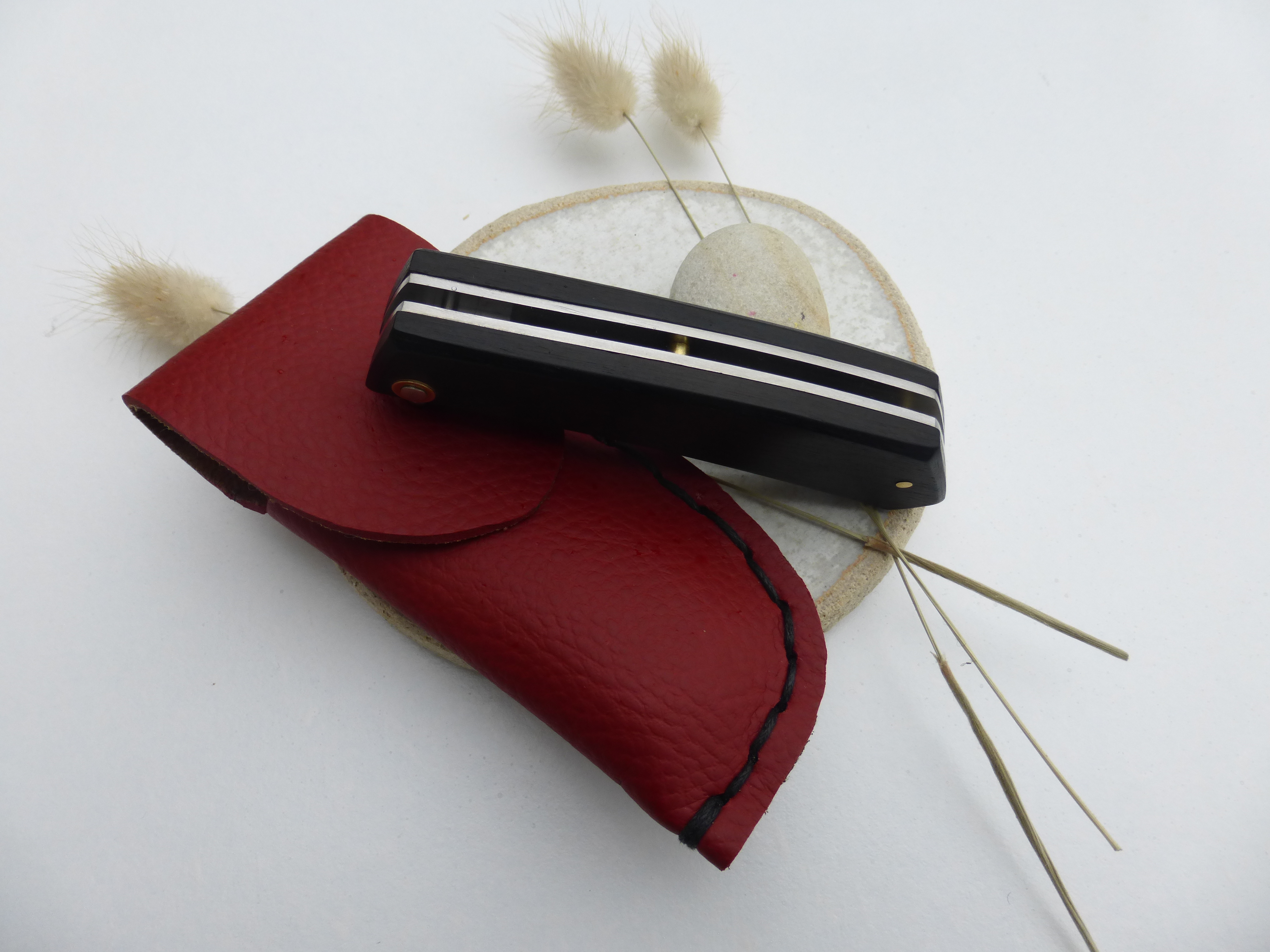 Étui : Cuir rouge cousu main, fermeture à bouton de col