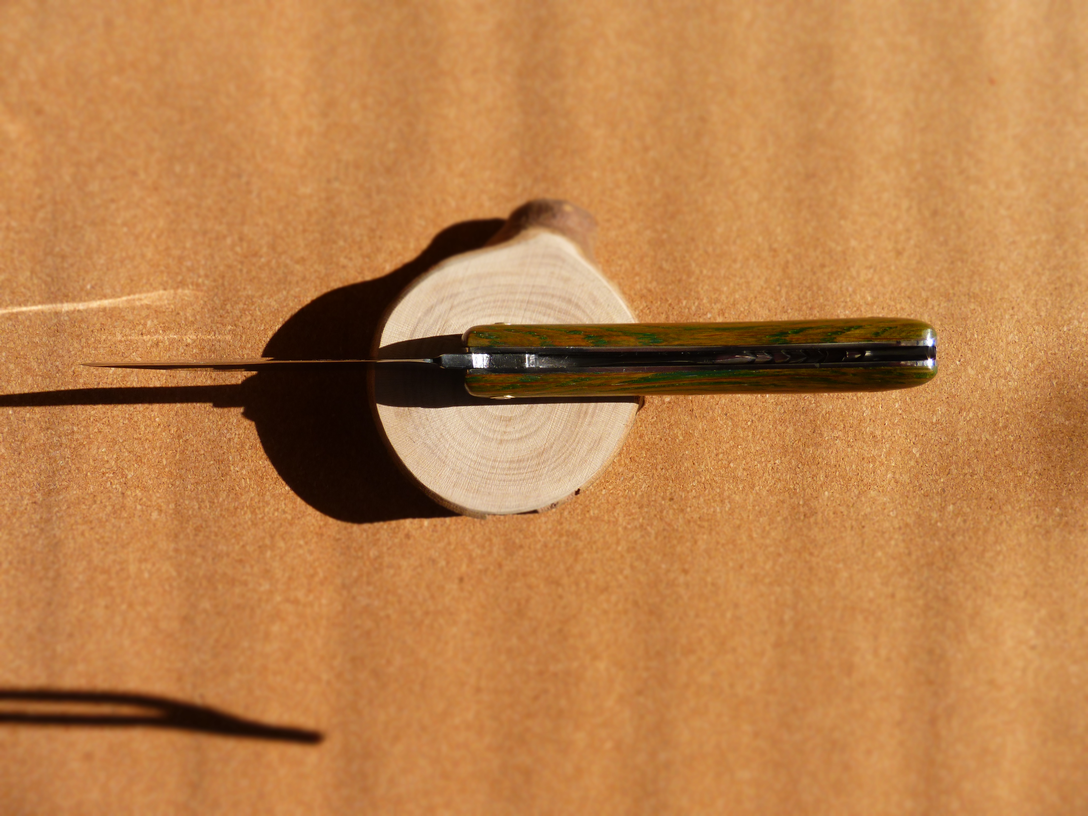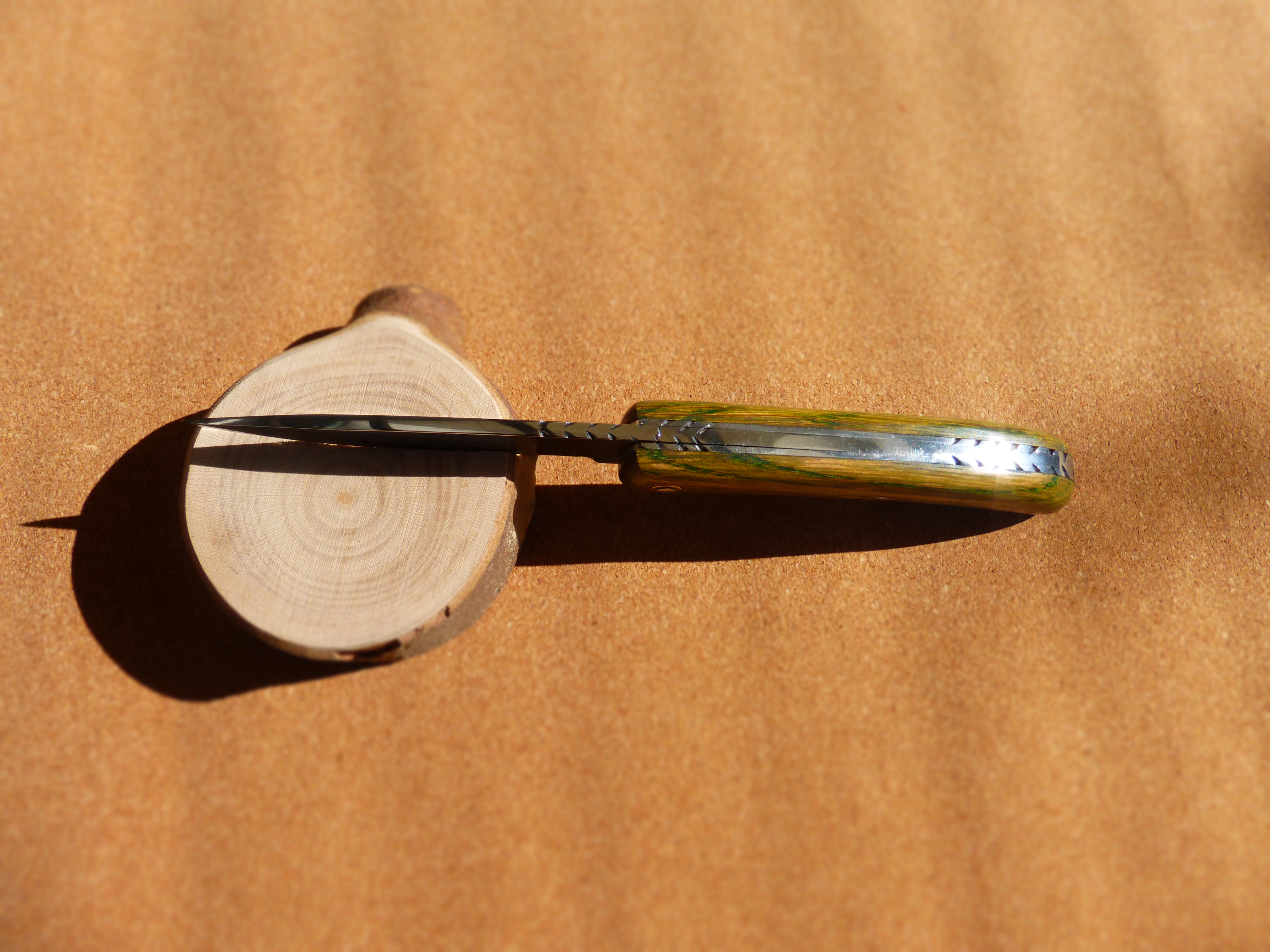 Manche : en bois de chêne stabilisé rafir teinté vert anis et ressort guilloché.
